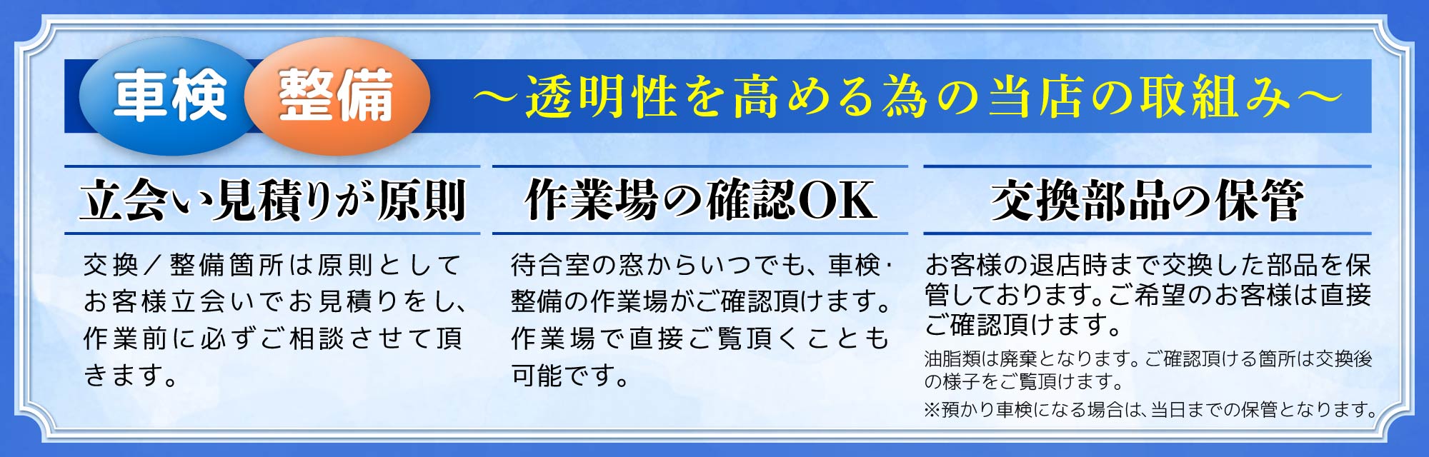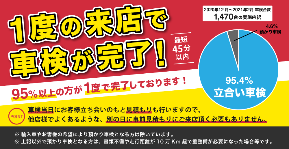 当店は、短時間車検を基本としておりますが、整備箇所が多い場合や部品取り寄せが発生した場合など、短時間で車検が完了できない場合も中にはございます。